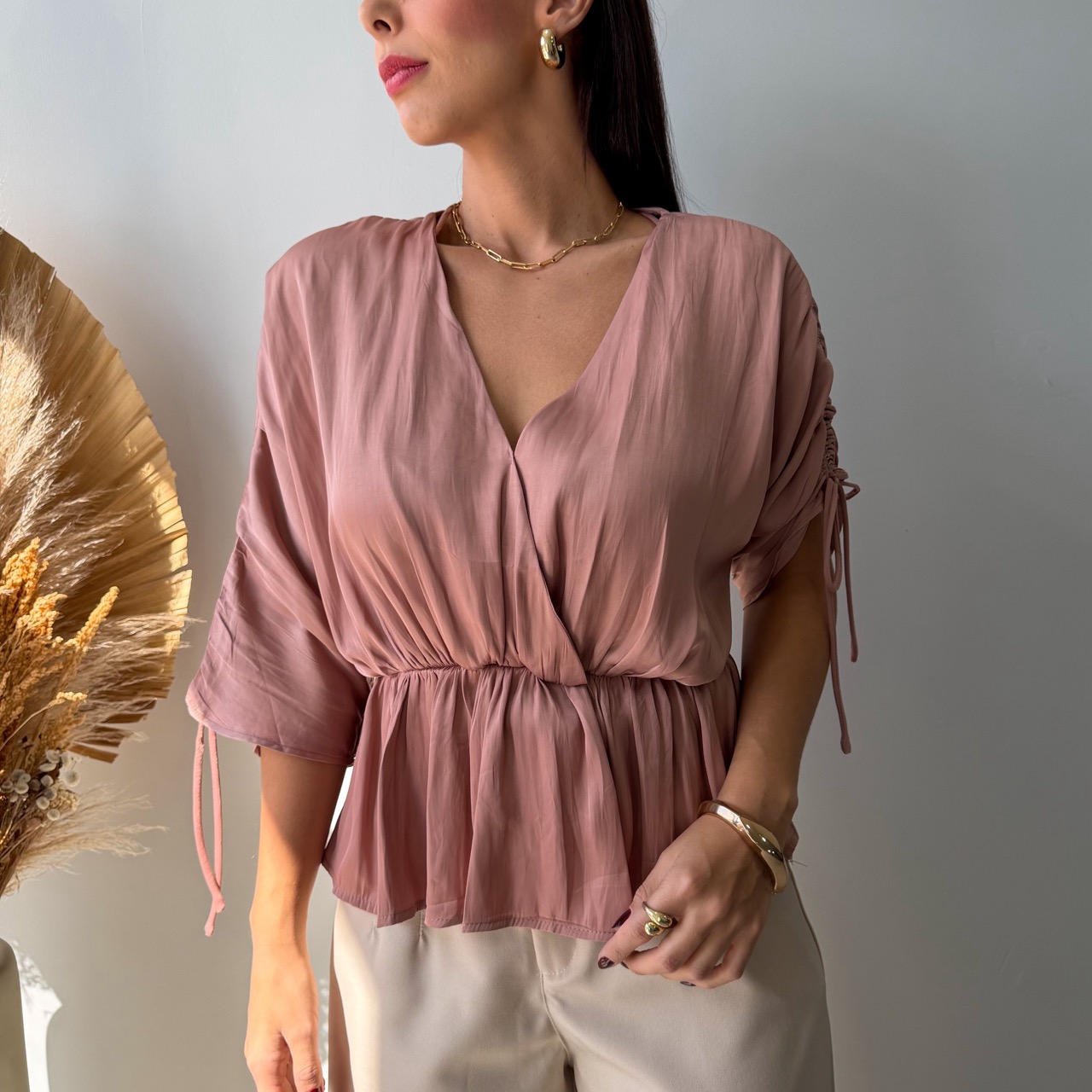 Se você busca uma peça com presença e sofisticação, essa bata é simplesmente perfeita. Com um caimento leve e tecido acetinado, ela traz aquele brilho sutil que transmite elegância na medida certa — verdadeira “cara de mulher fina”.