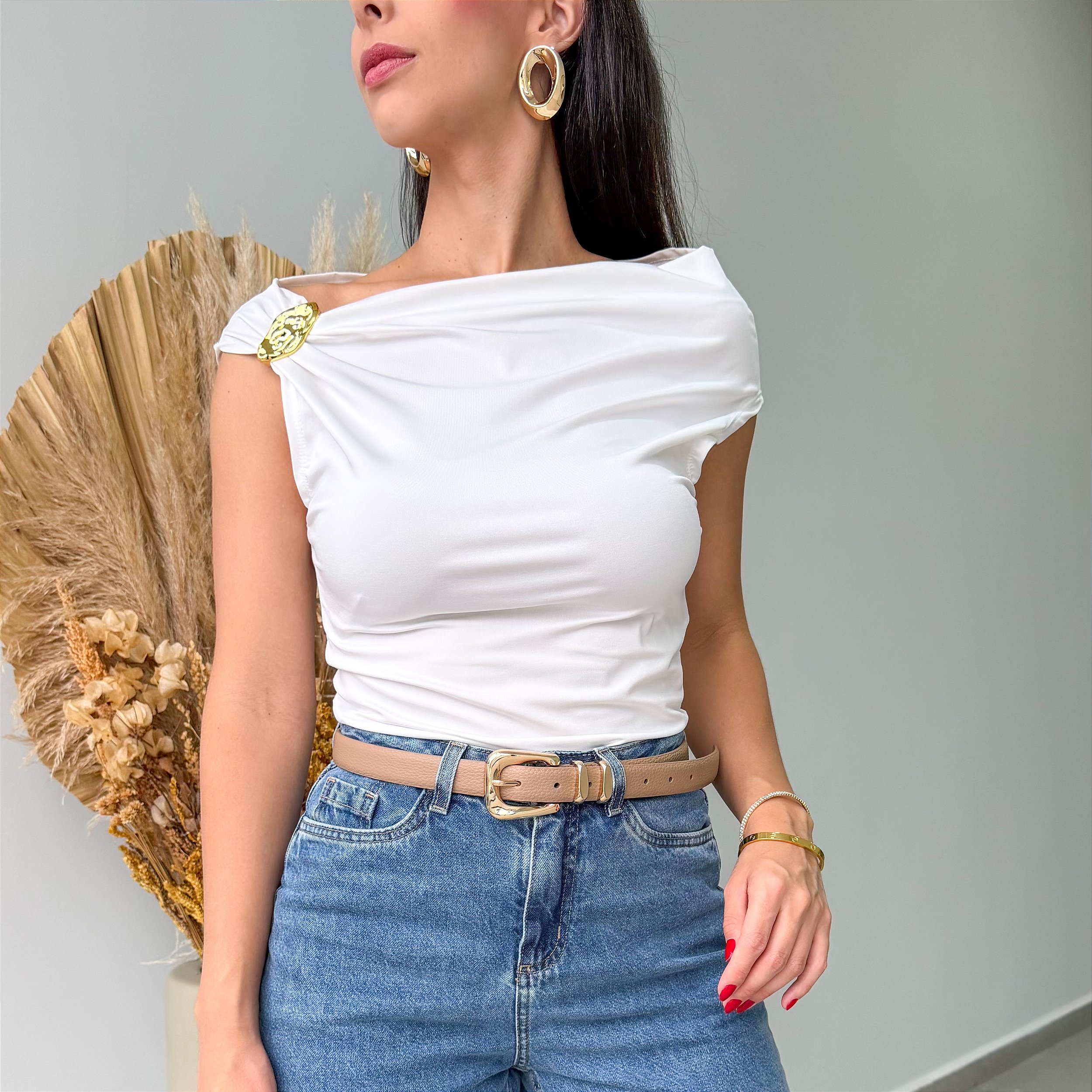 O destaque fica por conta da fivela dourada, que traz um glow elegante e transforma a peça básica em um look moderno e sofisticado.