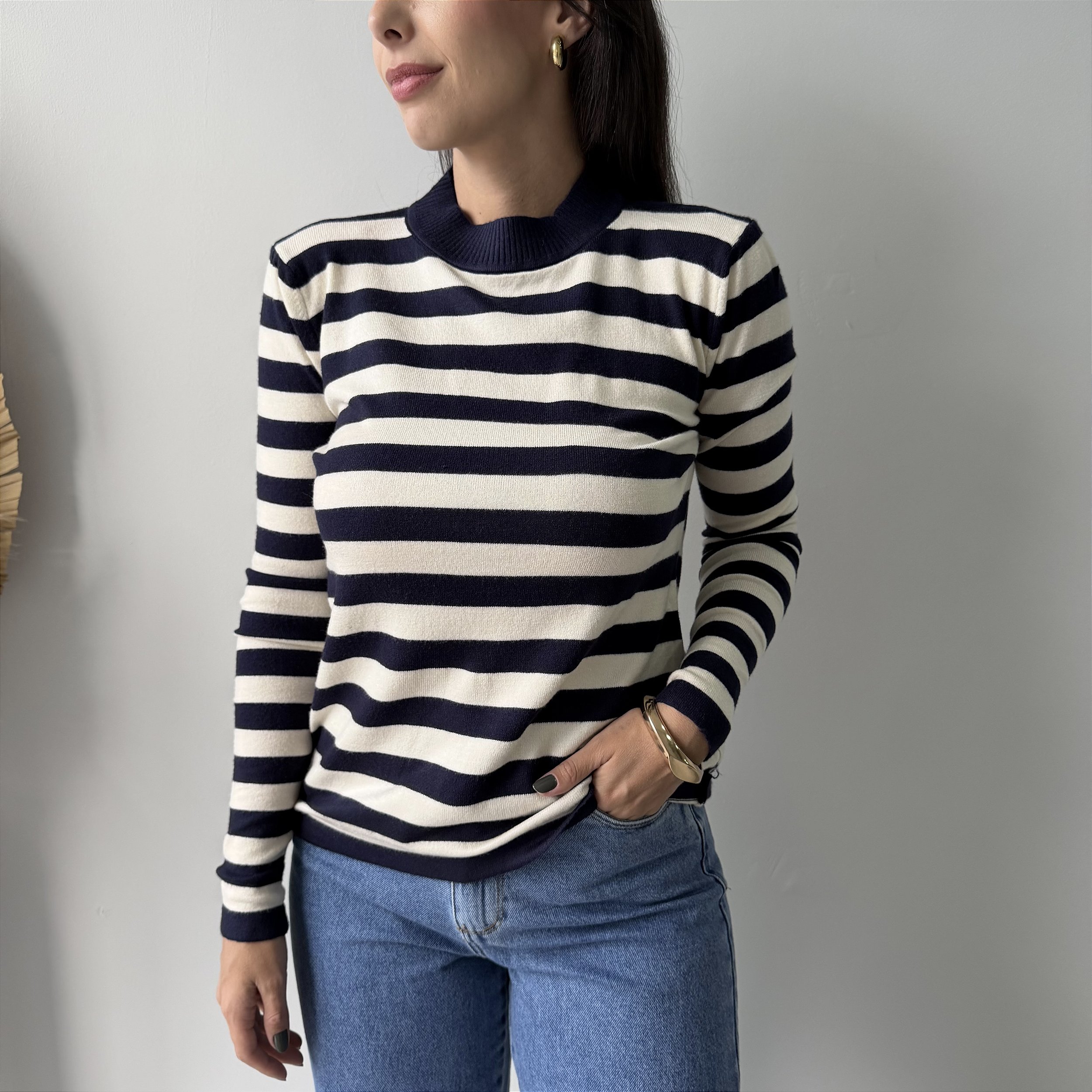 Confeccionado em tecido macio, ele oferece conforto, ótimo caimento e um vestir impecável, valorizando a silhueta com leveza e sofisticação. Seu design com listras clássicas traz um visual refinado e moderno ao mesmo tempo. Versátil e fácil de combinar, é perfeito para usar com jeans, alfaiataria ou saias, criando looks que vão do casual chic ao elegante com muita naturalidade.
