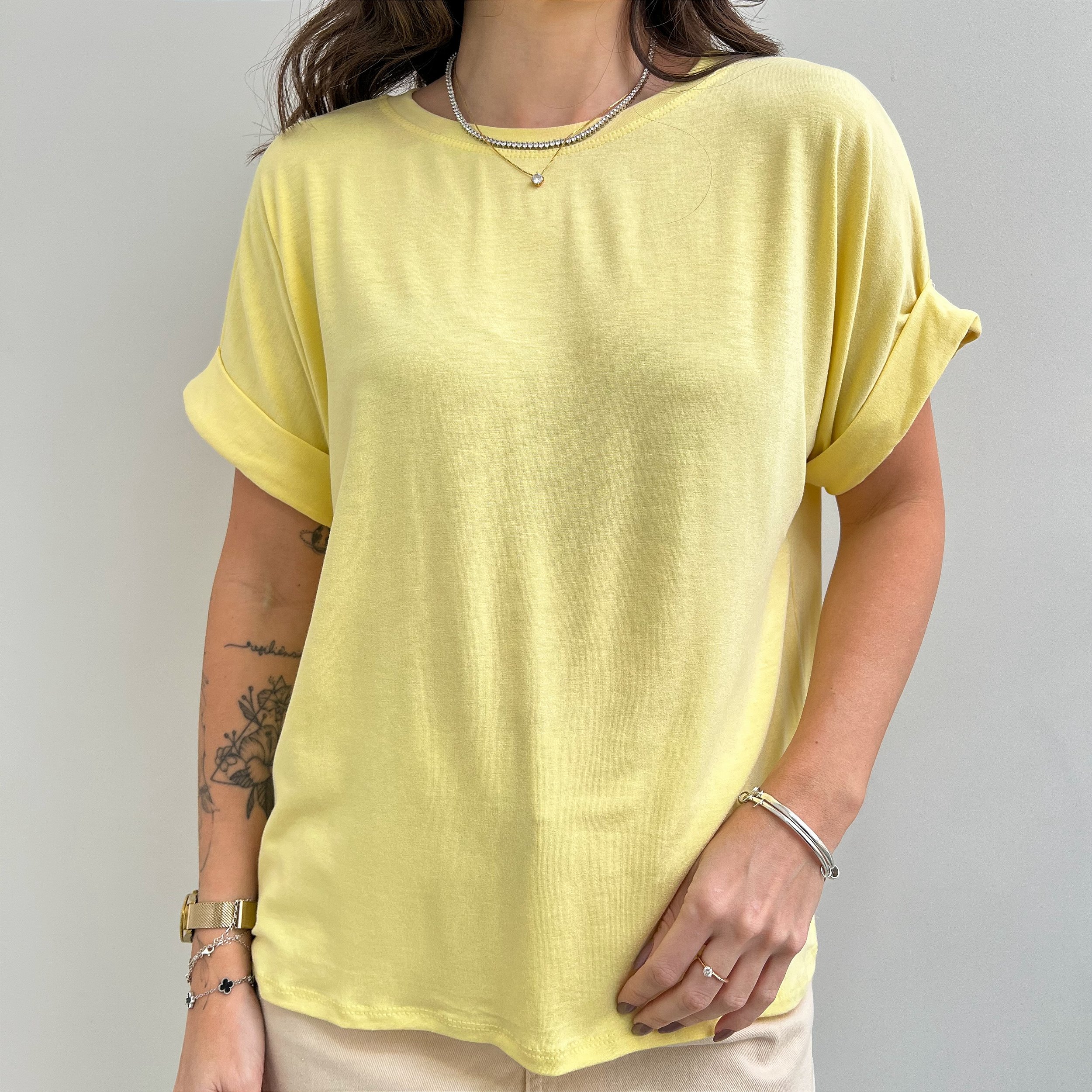 - Detalhe dobrado na manga para um toque de estilo - Modelagem básica com ótimo caimento - Tecido confortável e fácil de combinar - Cores Candy Colors que são tendência na primavera/verão - Ideal para usar sozinha ou em sobreposição