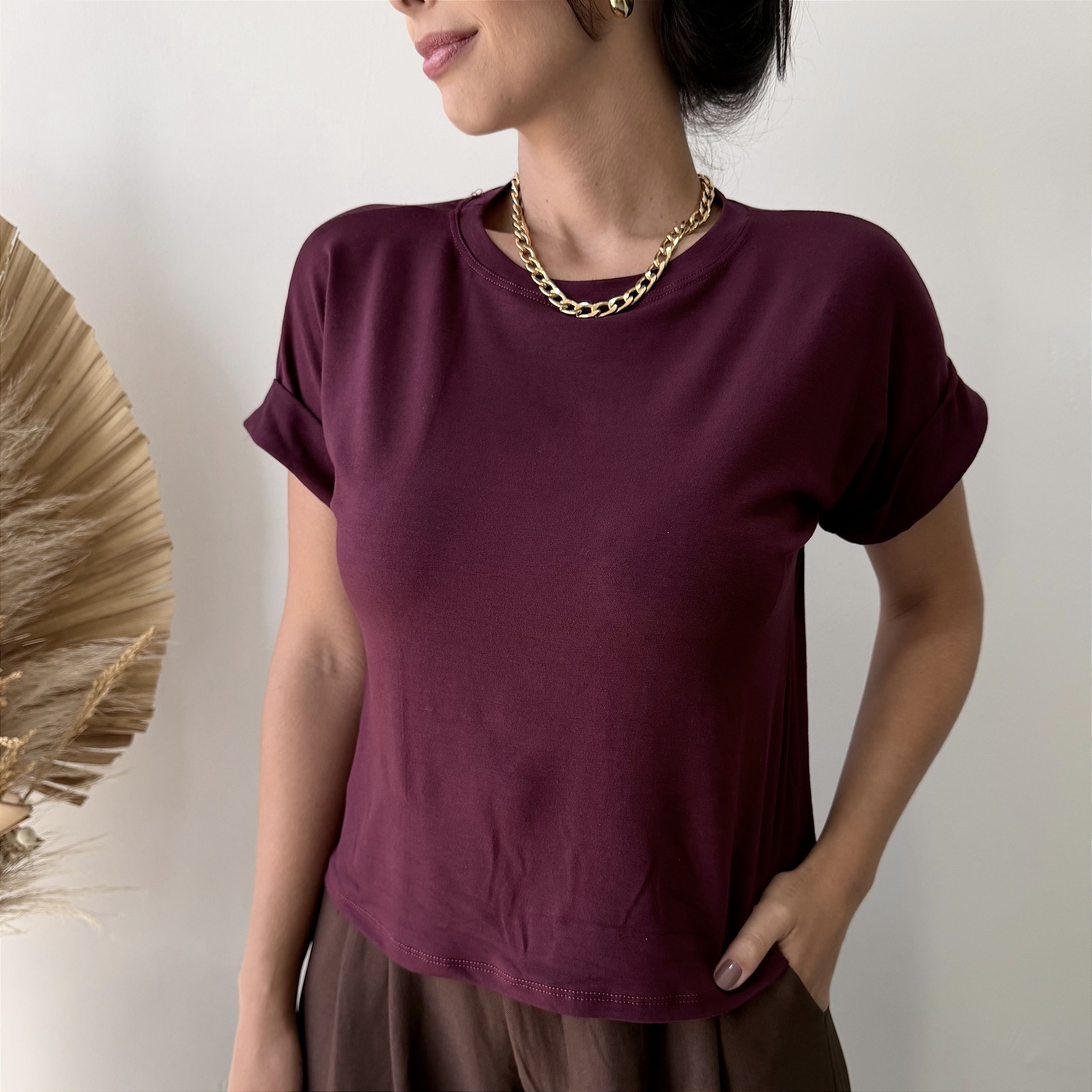 Com modelagem confortável e caimento impecável, ela veste de forma leve e elegante, valorizando o corpo sem marcar. O destaque fica por conta do charme da manga dobrada, que traz um toque moderno e despojado, enquanto as cores de outono deixam a peça ainda mais sofisticada e versátil para composições atemporais.